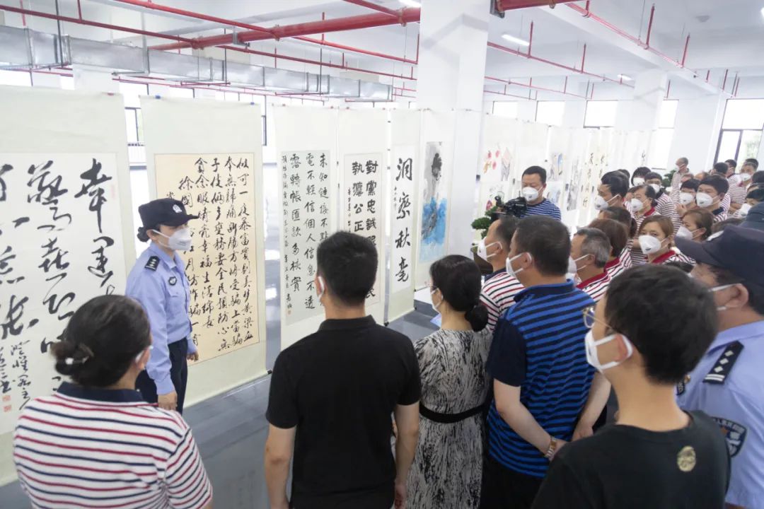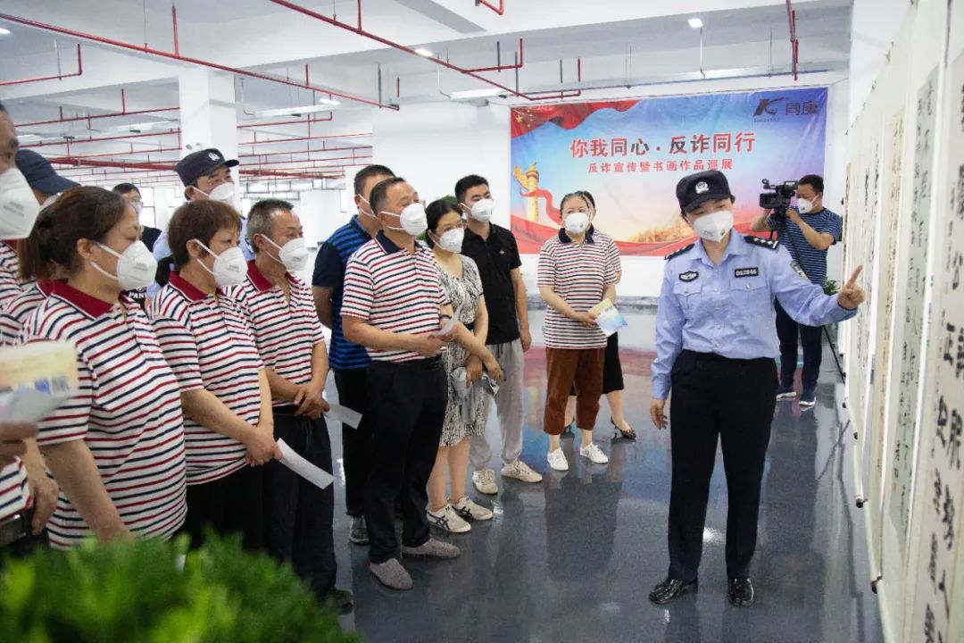 反詐宣傳過后,民警與企業員工共同參觀反詐宣傳書畫展。本次書畫展的作品涉及書法、水彩等多種形式,共計30余件,由南通市書畫界專業人士、社會各界書畫愛好者創作。將反詐主題詮釋得淋漓盡致的文化作品,讓本次活動取得了良好的宣傳效果。